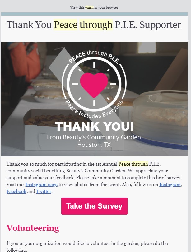 April 5, 2022March 30, 2025Peace through P.I.E. Email Campaign Community Email Marketing Peace and Unity Portfolio by admin We created a MailChimp email campaign for a Peace through P.I.E. event in Houston, TX.