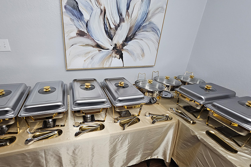 - Professional setup of tables, tablecloths, chafing dishes, and serving utensil holders