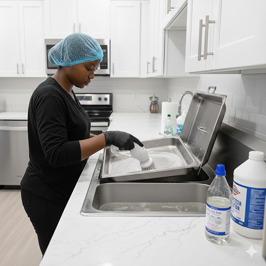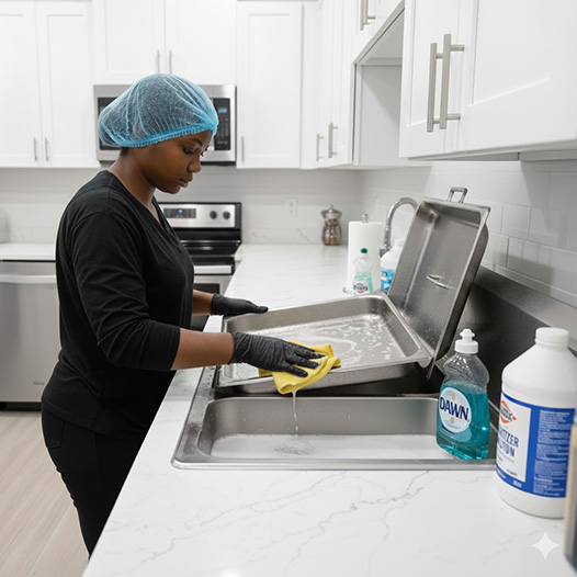 All of our stainless steel chafing dishes are throughly cleaned and sanitized. We clean it all! Food pans, water containers, food covers, fuel holders, cover holders, utensil holders, and frames are all cleaned, sanitized, and steamed. Each customer’s chafing dishes are cleaned with separate gloves, scrubbing pads, dishcloths, and scrubbing brush heads.