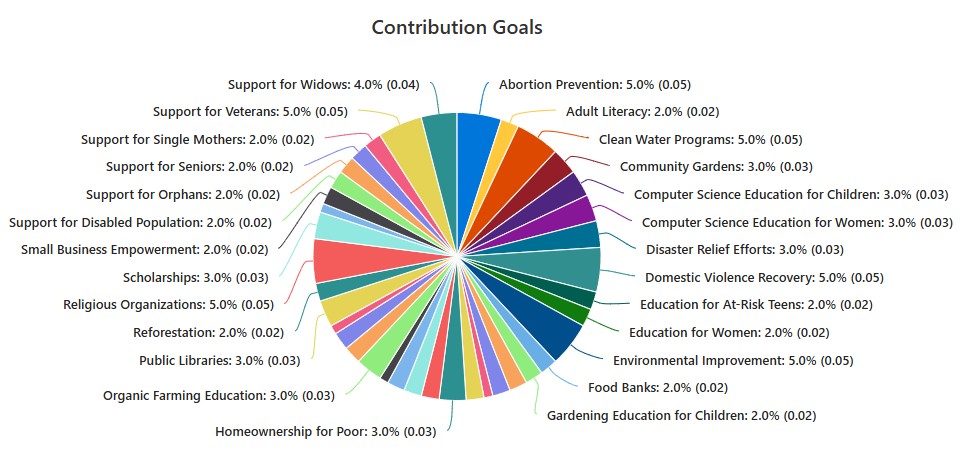 As you can see in 2026 the highest allocations are for support for veterans, religious organizations, abortion prevention, clean water programs, domestic violence recovery, and environmental improvement.